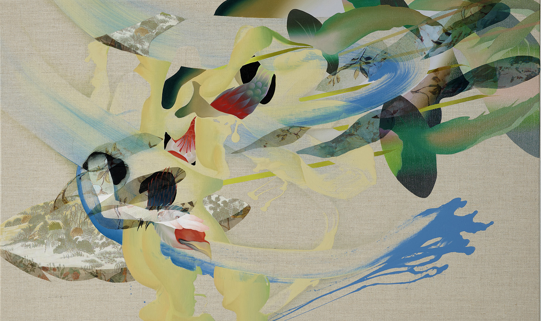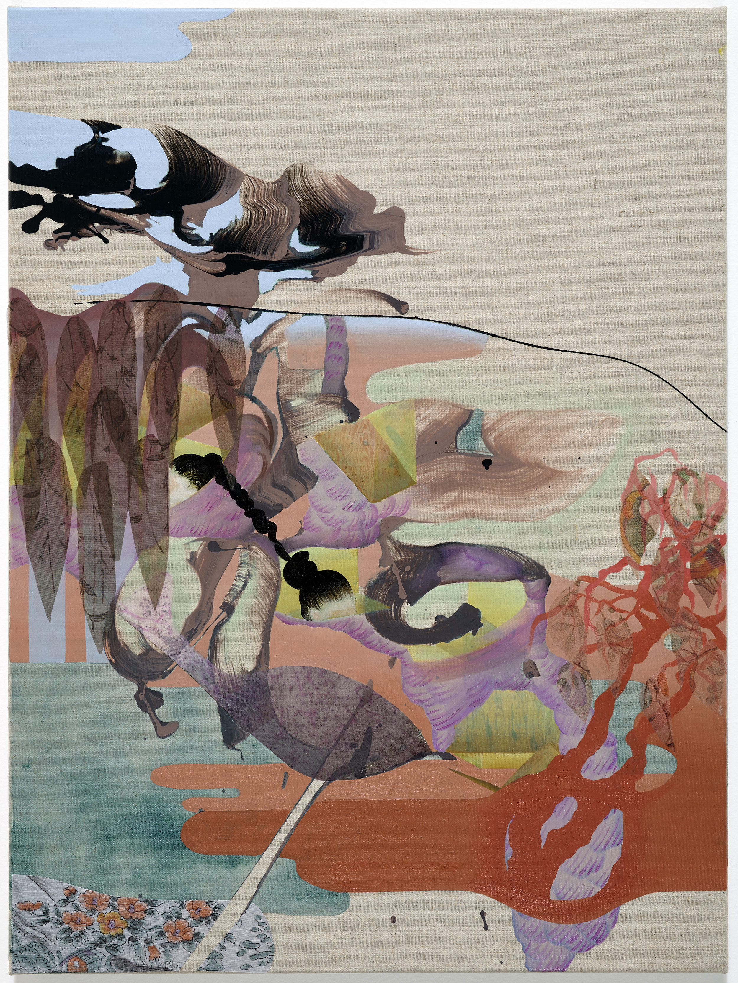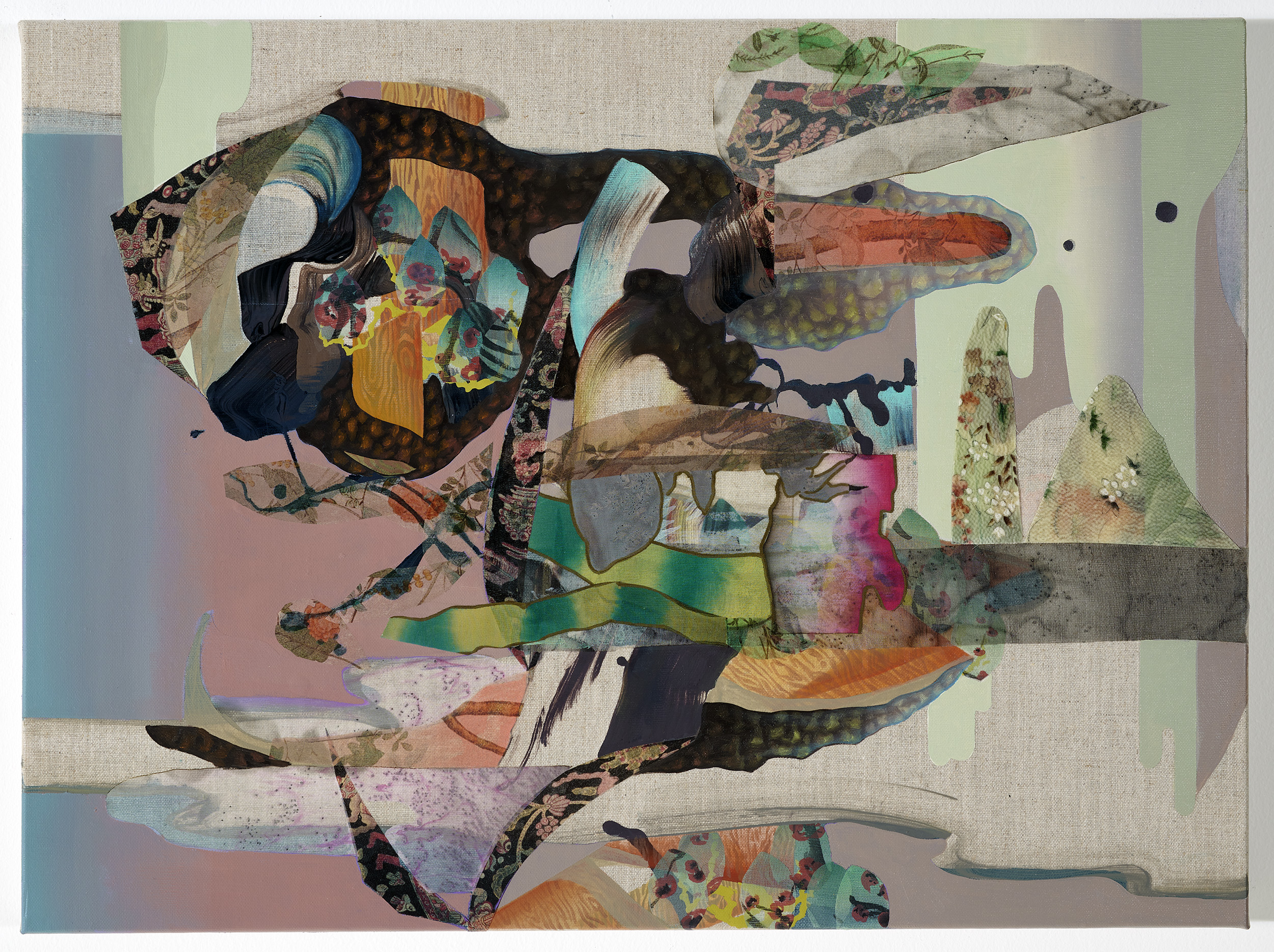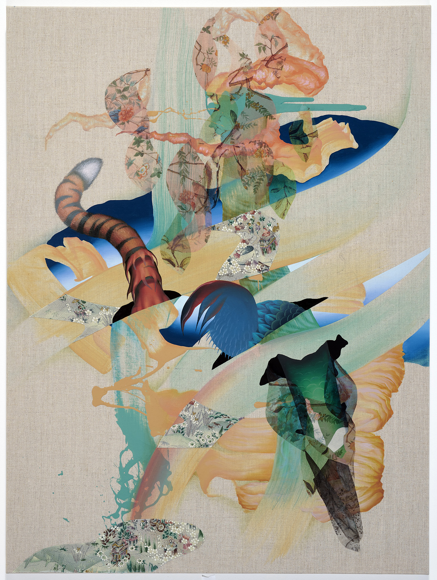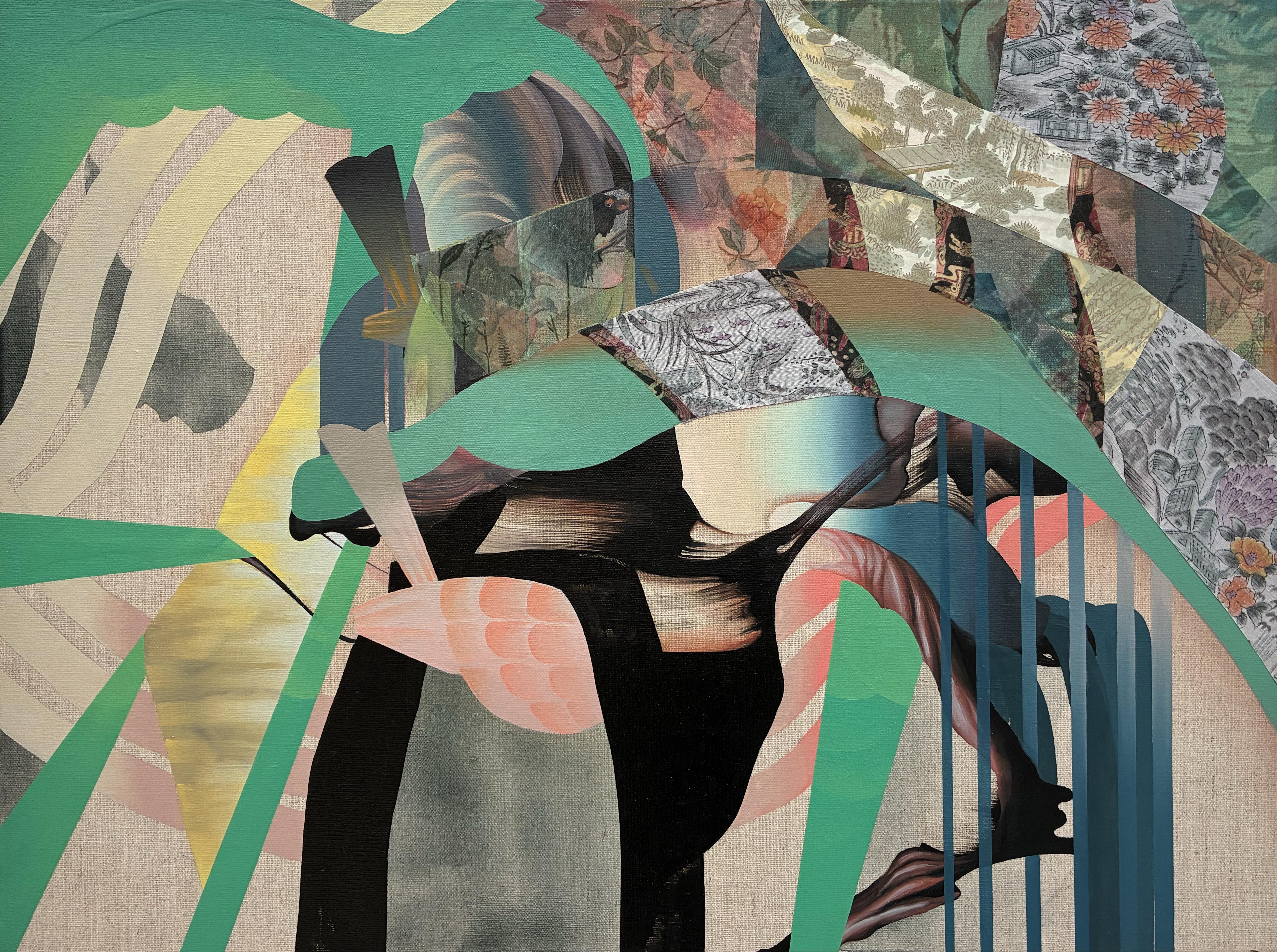 Drawing from the ecological concept of assemblage, where diverse elements come together to form interconnected systems, her floating islands are composed of paint, ground earth pigments, and painted silk that conjure mythical interpretations of plant and animal life. These dynamic collections function as open-ended gatherings. Meaning remains fluid and ever-changing as brief, expressive gestures from human forms choreograph intimate acts of ritual and love. Suspended as hovering islands in the sky, these works challenge fixed notions of place and home, presenting instead a poetic meditation on the frenetic processes of world-building and the profound losses experienced during times of war. Her work honors the solace found in Ninh Binh's natural world. Immersed in the creation of new mythologies, she celebrates the shared histories, strength, and resilience that have bound her family and refugee communities together.